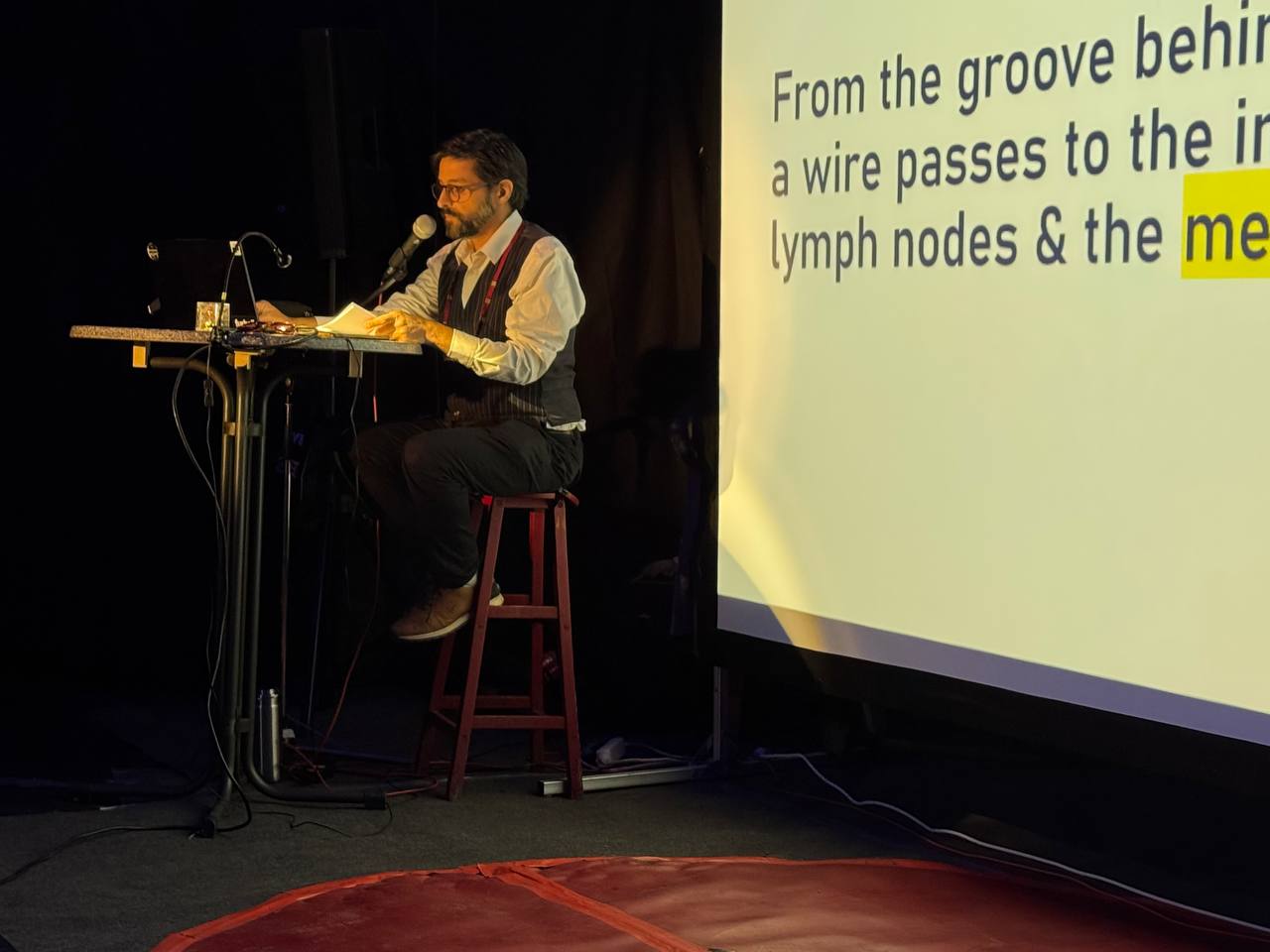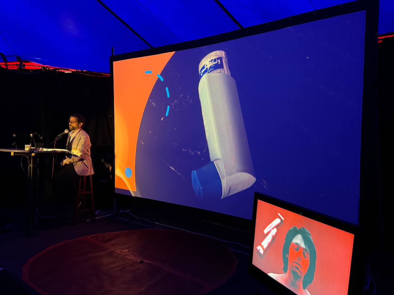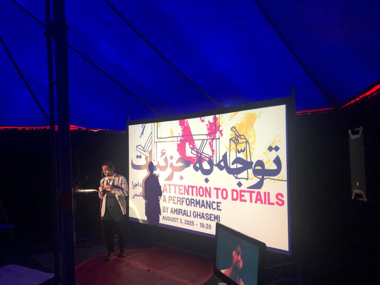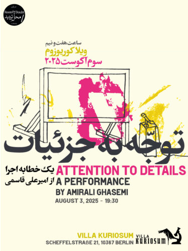 Attention to detail is a spoken word performance based on a text written by Amirali Ghasemi on a flight from Paris to Berlin in May 2023. The performance took place in the tent in the garden of VILLA KURIOSUM, presented in English, with a reading in Persian with corresponding English subtitles and visuals. Attention to details calls the body and the language in the presence of pain, illness, mixed with obsessive remembrance and involuntary amnesia.
