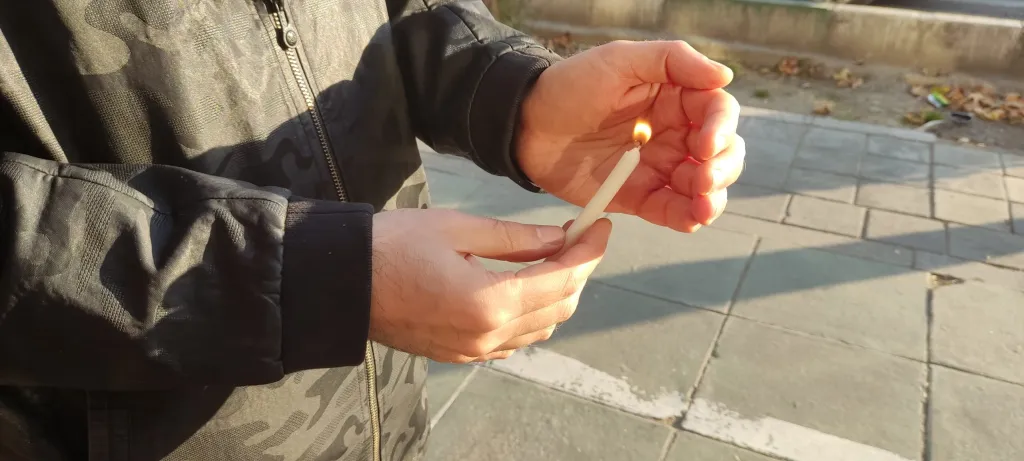 The performance is based on the final scene of Andrea Tarkovsky’s movie(‘Nostalgia’, 1983). The scene shows the leading character (the poet, Oleg Yankovsky) carrying a burning candle through the path of the Saint Catherine pool. The law is that every time the lighted candle goes out, he has to return to the beginning of the path and start moving again.