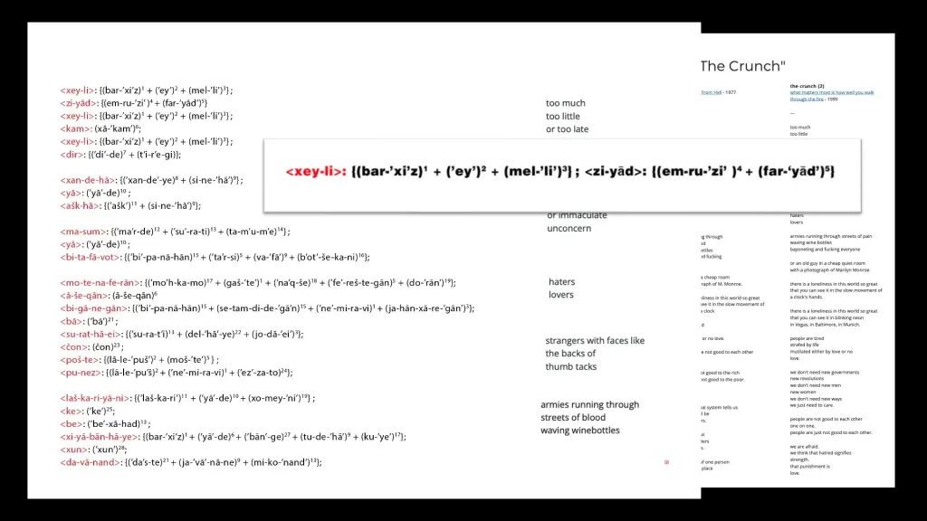 This time-consuming project, made between 2020 and 2021, is a sound collage based on the Persian translation of Charles Bukowski’s poem “The Crunch,” which the poet edited twice in 1977 and once in 1999.