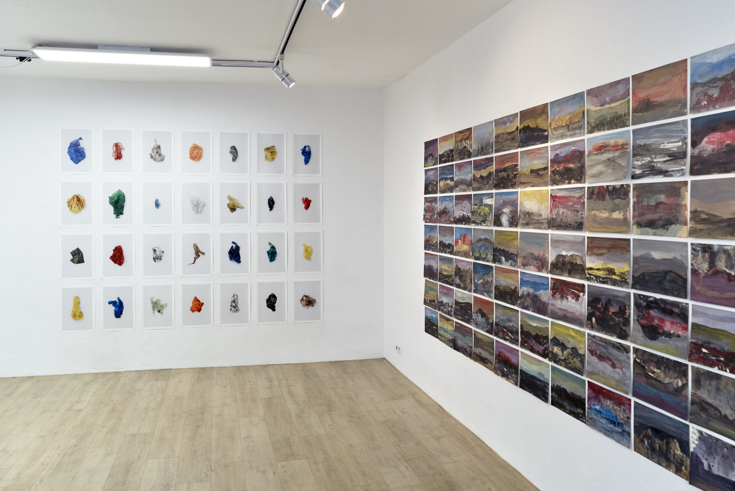 "Mechanical Reproduction of the Aura" by Ali Moameri is a selection of works on paper inspired by his homecoming when he moved his studio back to Ghaleh-Khan a village in Northern Khorasan. Wolfram Hahn’s “Plastic Bags, 2014—15” is realized through his countless wanderings through Berlin’s urban landscape and focuses on the individual characters of a mass-produced monochrome object.